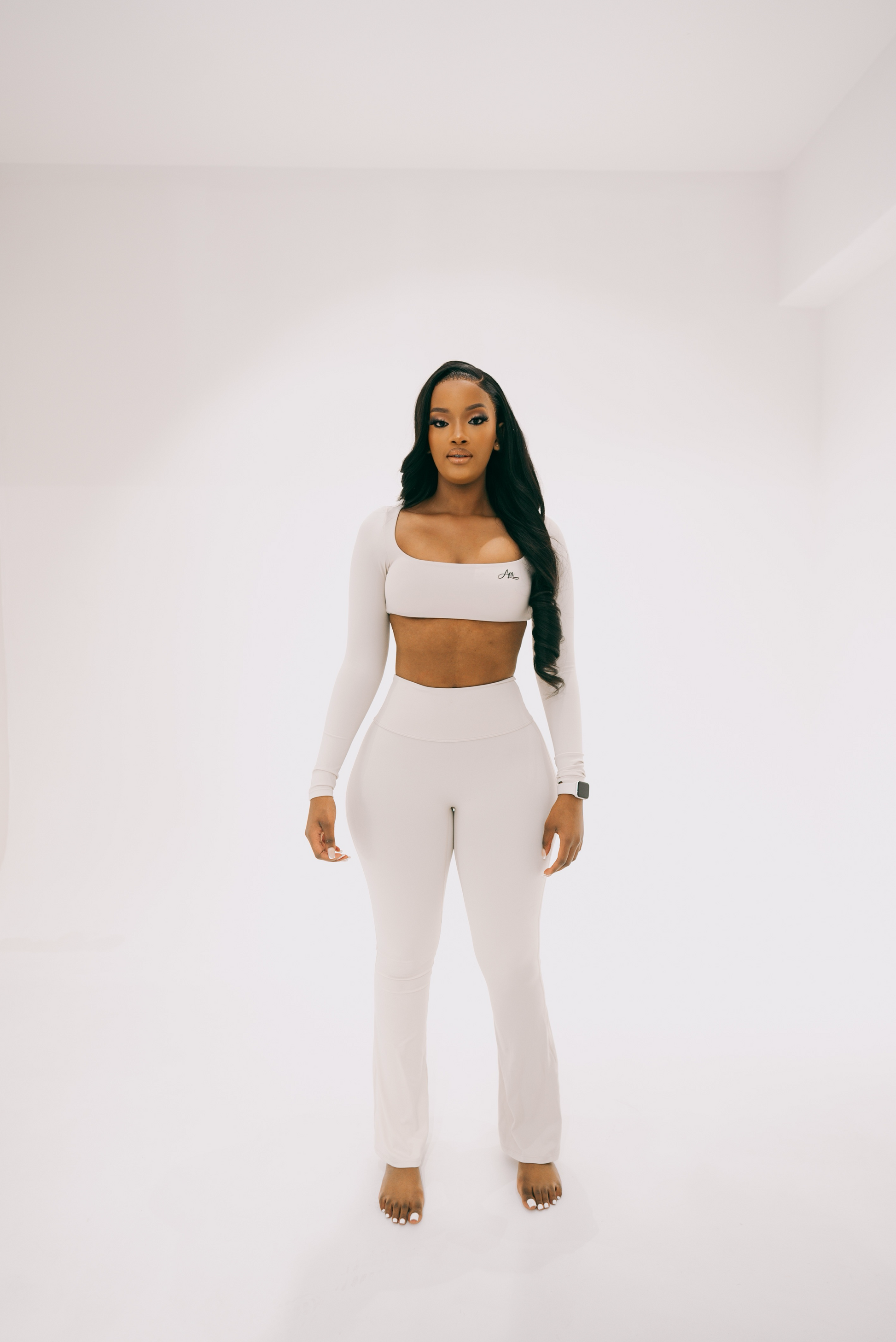 The Amara Set pairs a long-sleeve crop top with ultra-high-waisted flare pants for a flattering silhouette that transitions seamlessly from studio to street. Crafted in a soft, second-skin fabric, this set offers gentle compression and breathability while turning heads with its sleek simplicity.