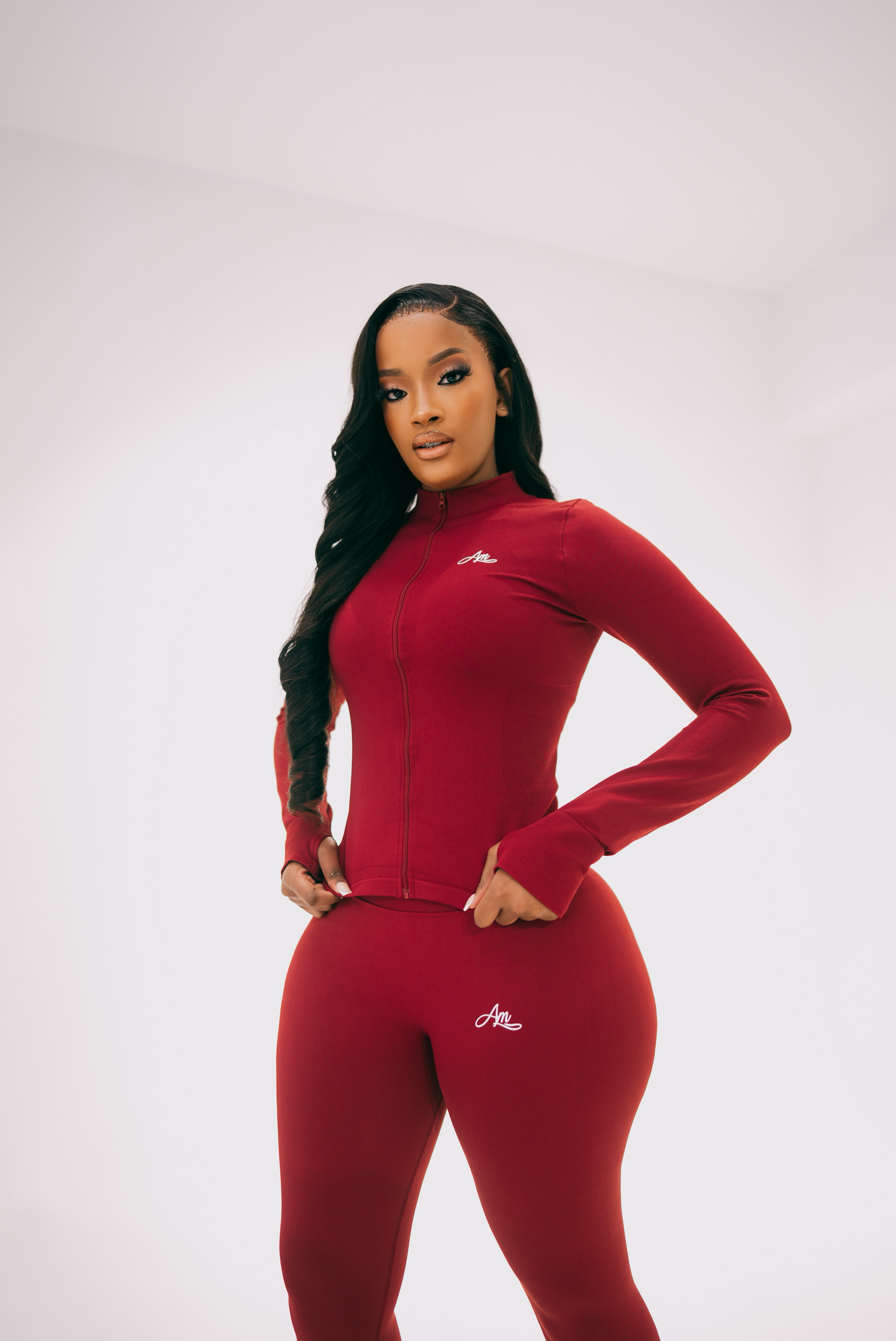 SOLD SEPARATELY, The Set Kirsty is your go-to for sleek style and effortless movement. Designed with a sculpted silhouette, this matching set features a zip-up jacket and high-waisted leggings that move with you while defining your shape. The bold merlot red and signature branding bring a luxe finish to this everyday essential.